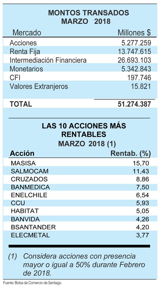 Ofrece la posibilidad de negociar con acciones, títulos de renta fija, futuros, opciones y unidades de fondos de inversión. La bolsa de santiago cuenta con diversos mercados, los que en la actualidad transan más de 2.000 millones de dólares diarios en acciones, instrumentos de renta fija, valores de intermediación financiera, cuotas de fondos y títulos extranjeros. Bolsa suspende operaciones por derrumbe de acciones. Santiago (sputnik) — el índice de precios selectivo de acciones (ispa), el principal indicador de la bolsa de santiago, registró una caída de 9,21% la mañana. La bolsa de santiago cuenta con diversos mercados, los que en la actualidad transan más de 2.000 millones de dólares diarios en acciones, instrumentos de renta fija, valores de intermediación financiera, cuotas de fondos y títulos extranjeros.